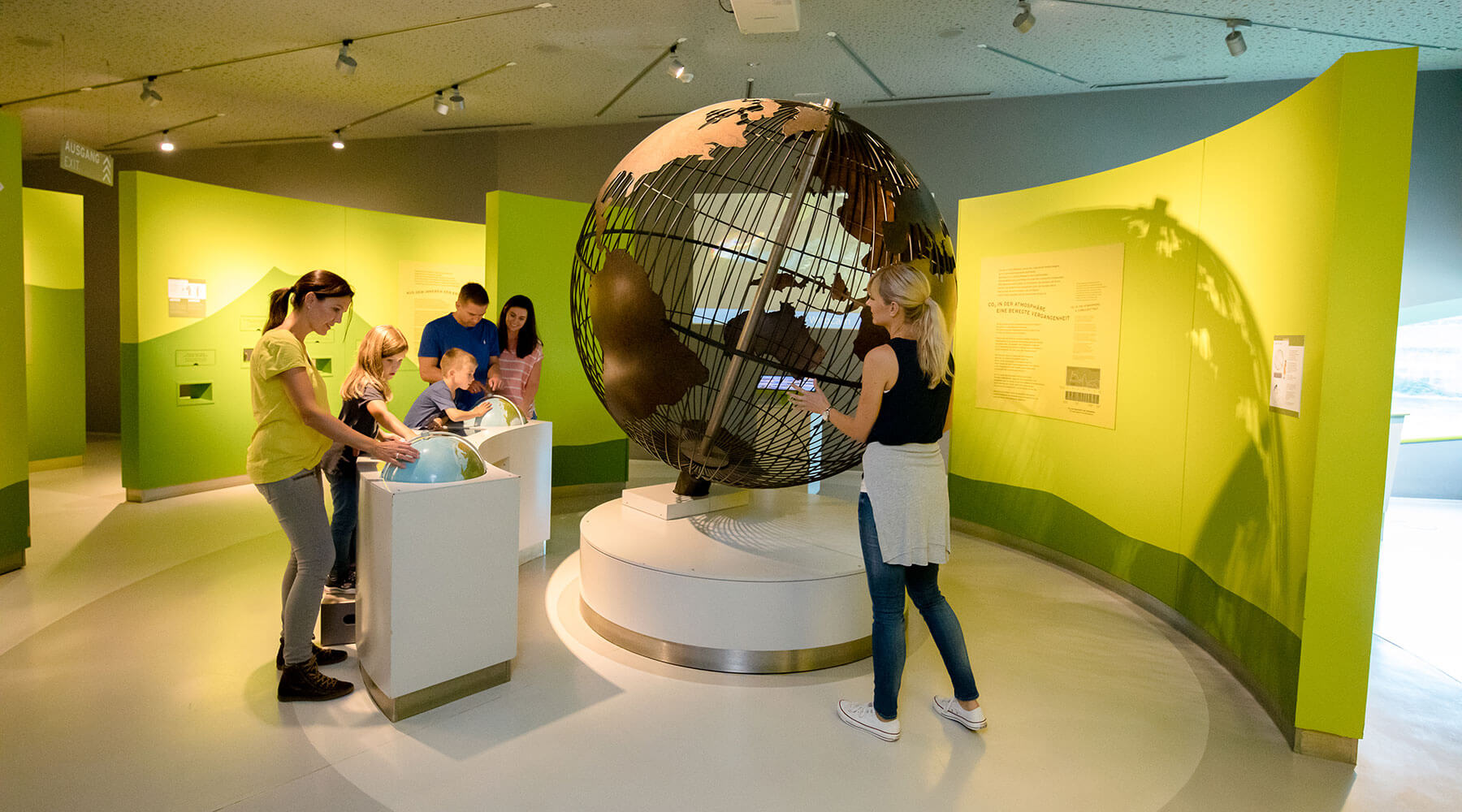 Besucher stehen in einem Ausstellungsbereich des Geysir-Zentrums und sehen sich eine Weltkugel an. © Martin Christ